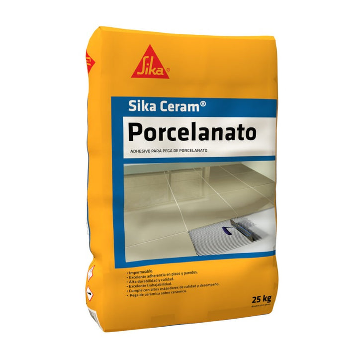SikaCeram® Porcelanato es un adhesivo cementicio, de color blanco o gris, elaborado con latex y otros aditivos especiales para mejorar su desempeño, mezclado con agua forma un material de pega de gran adherencia para piezas de baja y mediana absorción tipo porcelanato en interiores.